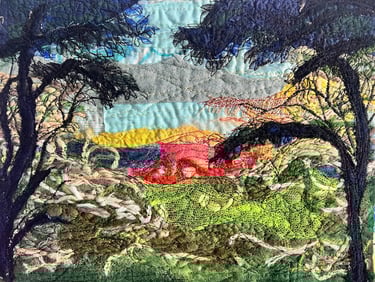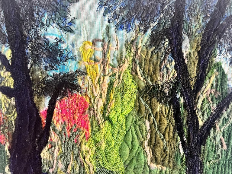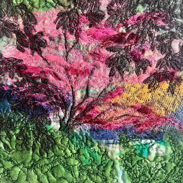 After completing Pink Trees, I wanted to explore further the impact of changing the directions of threads in my machine embroidery. In my painted works, brushstroke direction and textures created using a palette knife feature heavily to create movement and shape. In these two works, I am exploring how this may be transferred and recreated in the medium of fabric collage and free-motion embroidery.