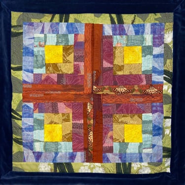 This wall hanging quilt is a visual representation of my own personal hygge. Each colour block has been laid out in a log cabin style, the colours representative of a different touchstone. Each colour piece was made using collaging and free-motion embroidery and then cut into strips to form the blocks. There is continuity in the threads, each colour from the last block continuing on into the next.